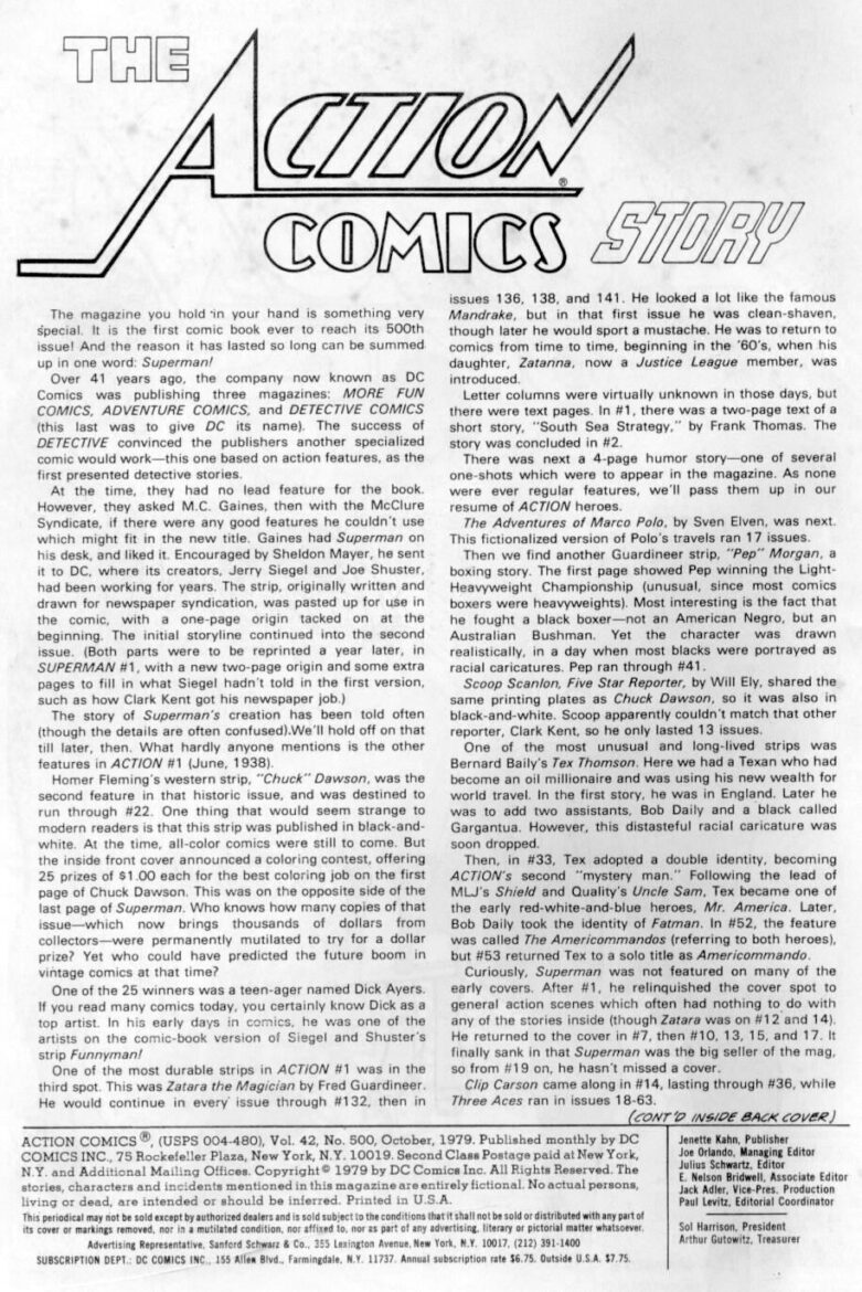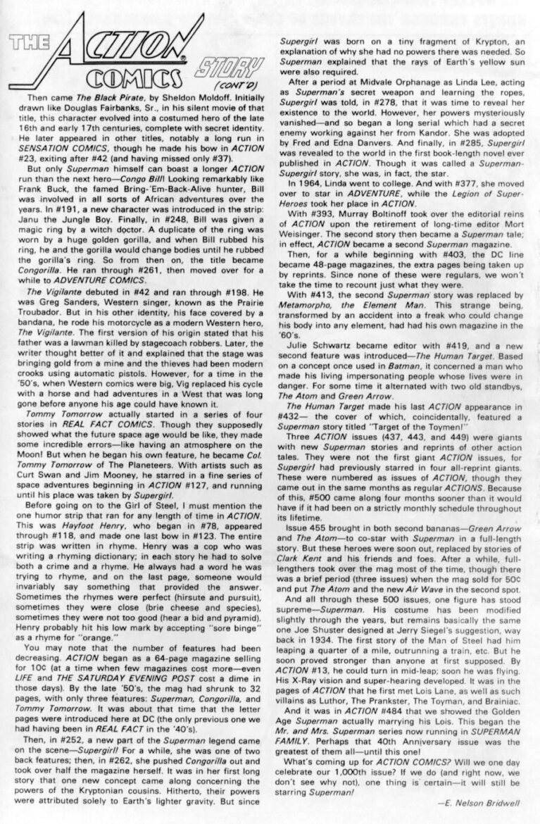 In this special issue, E. Nelson Bridwell provided an essay covering the history of Superman and Action Comics. Behold: